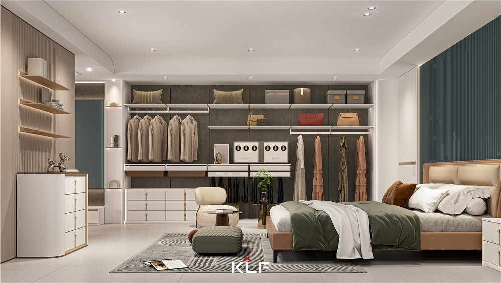 卧室背景板应用了极光白的S弧形护墙板+菱形格+圆弧波浪板,凹凸有致,以光影感成就空间艺术感;床头柜沿用IP雕刻门板+两侧圆弧设计,让小床头柜也颇具特色;衣柜采用悬挂系统,整体敞开式布局增强空间通透感。