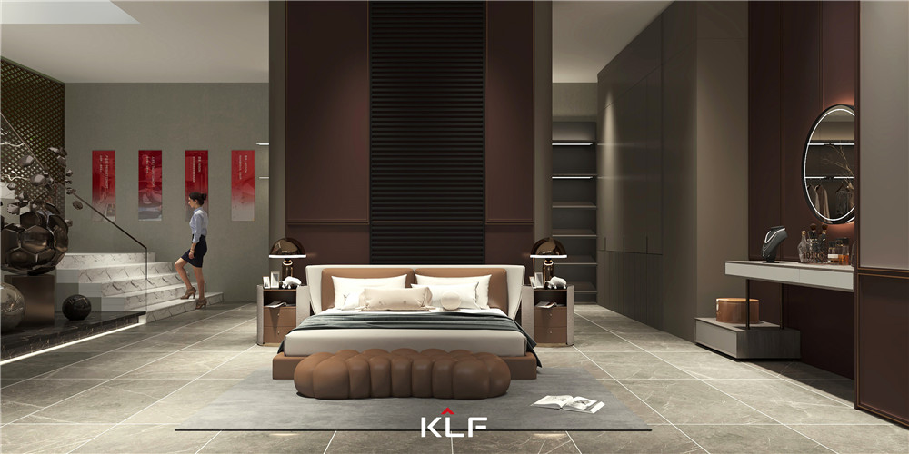 卧室空间以莫兰迪红构建出空间的高级优雅,不同材质的碰撞展现出定制的内在韵味,更有仿真烤漆光泽的哑系列, 给广大客户不一样的触感, 拥有抗刮性能。