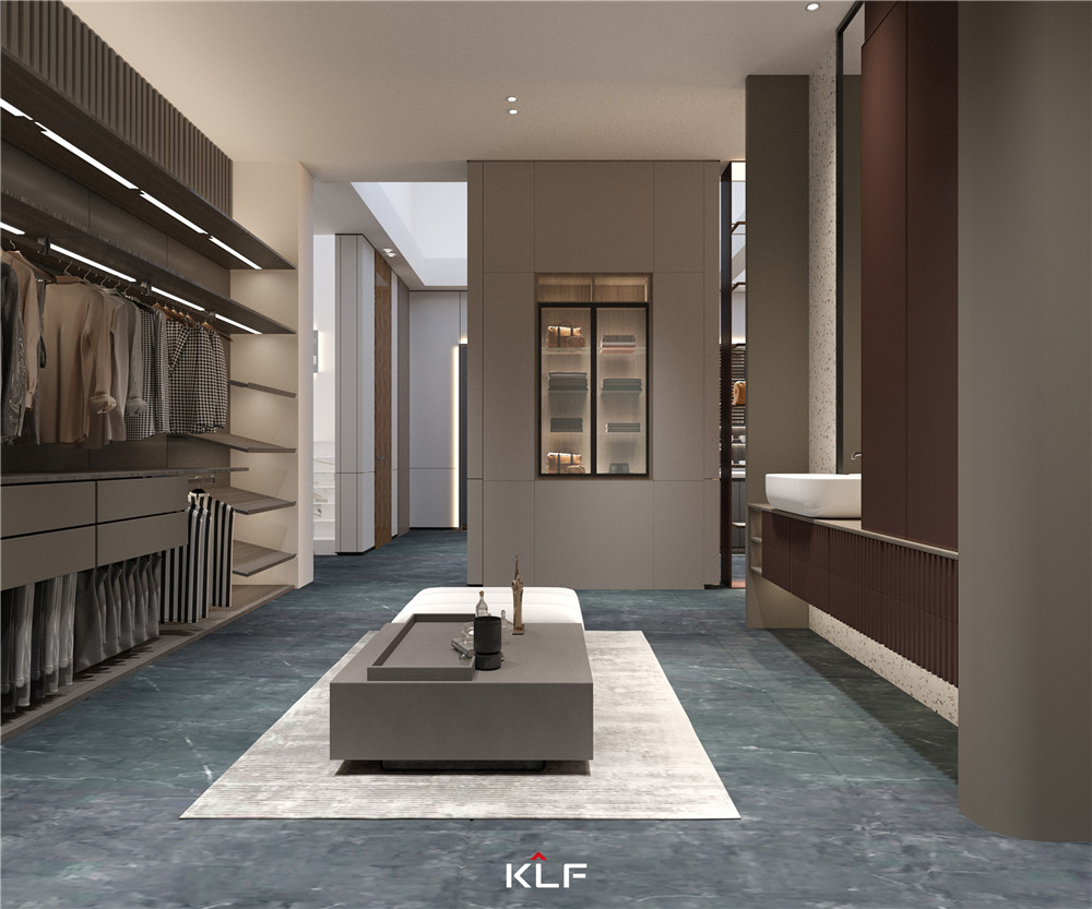 衣帽间采用浅可可同色水漆柜门及墙板,以不同材质间的碰撞实现真正定制!365WMSPORTS全壁挂式结构的运用,让衣帽间具有奢华感,分功能收纳更省心。